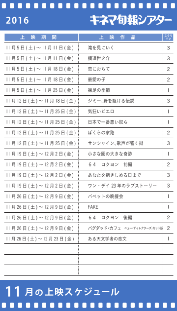 キネマ旬報2016年1月上旬号「2016年映画の旅」特集と連動したリストをご用意。キネマ旬報編集部の勧める作品が知りたい!という方は必見。それぞれ個性の違う編集者3名の見たい作品をリストにしました。
