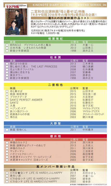 二宮和也出演の最新作「母と暮せば」を増刊号発売記念企画!嵐のメンバー5人が、過去にどんな監督の作品に出演したのかをリストにしました。 見逃した作品がないか、もう一度見たい作品はどれか?など、チェックしてみてはいかがでしょう?