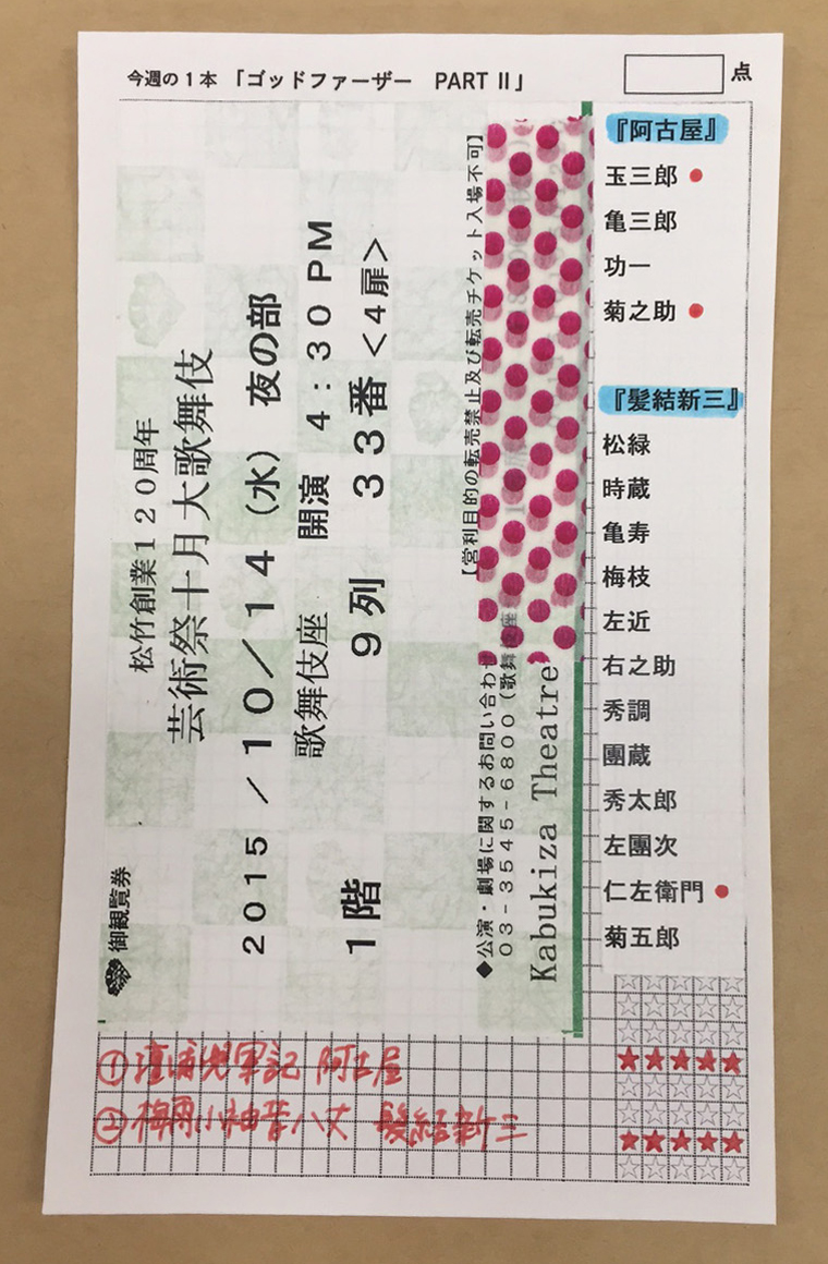 観に行った映画、舞台、ライブなどの作品タイトルや感想は必ず記録。月に一度は観劇している大好きな歌舞伎も、チケットの半券は捨てずに出演者リストと一緒に貼りました。空いたスペースには、この日の演目名『壇浦兜軍記 阿古屋』『梅雨小袖昔八丈 髪結新三』と、その満足度を5つ星で評価しています。