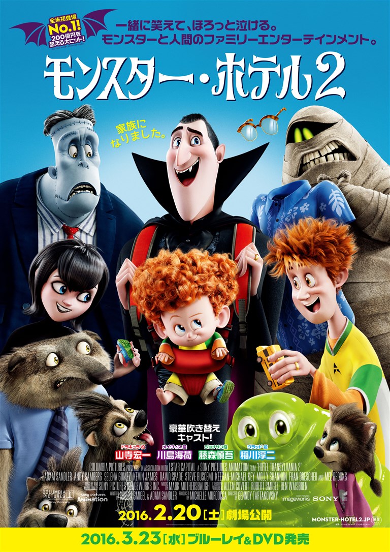 第1作では城を人間たちに焼かれて、愛妻を失ったドラキュラ伯がモンスターたちを人間から守るためにホテルを作り、フランケンシュタインなどの妖怪キャラクターが次々に集まってくるテンポがよかった。愛する娘がヒッピーまがいの人間に恋して大騒動になるのがおかしく、好評につき、続篇ということになったわけだ。モンスターの娘が人間と結ばれた結果、生まれてくるドラキュラ伯の孫は、人間かモンスターかという風変りな物語が展開。絵や音響に質感があるので、今回も楽しめた。