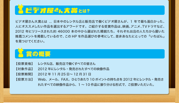 第3回ビデオ屋さん大賞 結果発表!! 毎日たくさんの作品を観ている全国のビデオ屋さんが、2012年にリリースされた約46000本の中から本当に面白いタイトルを大決定!
