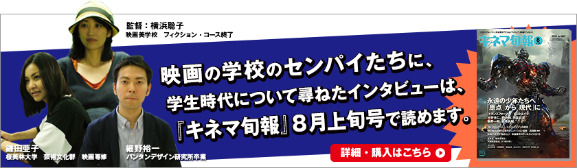 2014年3月にリニューアルが完了したばかりの中野キャンパスへ。中庭を囲むスタイリッシュな校舎内にあるスタジオやMA室、35ミリフィルム上映もできるシアターなどを見学。こうした施設がここで学ぶ3〜4年次の学生たちの作品作りを支えているという。16ミリのフィルムでの撮影から、テレビ番組の制作、アニメーション、CGなど、映像分野のさまざまな表現を基礎から学ぶことができるのが同大学の特徴。案内をしてくださった李容旭教授によれば「1年次にすべての領域を体験し、2年次には関心のある分野をさらにしぼり、3年次からは研究室に入ってより専門的に学んでいきます」とのこと。こうしたカリキュラムは「映像に関する仕事をしたいけれども、具体的な分野がわからない」という人にはぴったりではないだろうか。一人一人の個性を生かした教育方針がとられており、「学生が何を作りたいか」から出発する卒業研究にも多様なジャンルの作品が並ぶ。卒業生で、「祖谷物語—おくのひと—」を35ミリフィルムで撮り上げた蔦哲一朗監督も、このような大学での経験とサークル活動を作品作りにつなげたという。