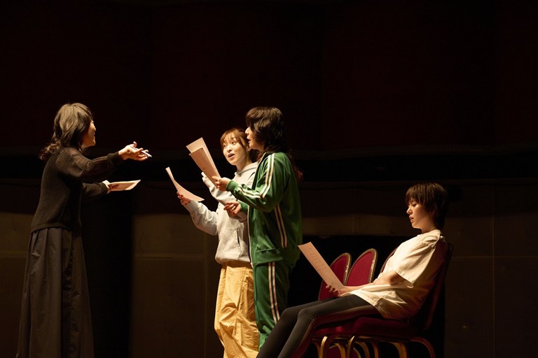 スタジオに集められた4人の女優たちは、30ページの台本に3日間かけて向き合い、4日目に舞台公演をすると告げられる。配役は未定。閉ざされた環境で、スマホや時計を預けさせられて動揺しながらも、希望する役を掴むため、4人は稽古に打ち込んでいく。二流の役者、売れない役者、大根役者、言われるがまま演じることに満たされなくなった役者……。稽古を通して、後には引けない各々の事情が次第に浮き彫りになり、人間の本質が暴かれていく。演出家、監督不在という演技の無法地帯で、役者人生を賭けた芝居がぶつかり合う。そして迎えた4日目。仮面をつけた観客が見守る中、4人は役者としての本質を発揮し、舞台を成功させることができるのか……。