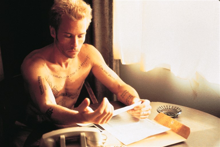 保険の調査員レナードの家に何者かが侵入し、妻がレイプされたうえ殺害される。その光景を目撃した彼は、激しいショックで前向性健忘という珍しい記憶障害になってしまう。10分間しか記憶を保つことができない彼は、謎の女ナタリーに助けられ、ポラロイドにメモを書き、体にタトゥーを刻みながら、妻を殺した犯人の手掛かりを追う。犯人のキーワードは、ジョン・G。だが、謎を追えば追うほどに、さらなる謎が深まる。ジョン・Gはいったいどこにいるのか? だれの言うことが、いったい本当なのか?