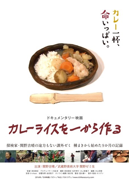 アフリカから南米までの人類拡散の道のり“グレートジャーニー”を逆ルートでたどった探検家・関野吉晴は、教授を務める武蔵野美術大学で一風変わった課外ゼミ活動をしている。通称“関野ゼミ”。手作りのカヌーでインドネシアから沖縄まで風任せの旅を敢行したり、船作りに必要な斧を砂鉄集めから始め、“たたら製鉄”の手法で作ったり、ユニークな取り組みは話題を呼んだ。そんな関野が2015年に始めたのが、“カレーライスを一から作ってみる”という試み。野菜や米、肉、スパイスなどの材料をすべて一から育てるというこの途方もない計画に、学生たちと取り組んだ。“モノの原点がどうなっているかを探していくと社会が見えてくる。学生たちにはカレー作りを通して色々なことに気づいてもらいたい。” それが、関野の狙いだった。集まった数十人の学生たちは、知らないことや慣れないことばかりの現実に悪戦苦闘しながらも、野菜や米、家畜を一から育てていく。思ったよりも生育が遅い野菜を見て“化学肥料を使ってもいいのではないか”、“いや、使うべきではない”と意見が分かれたり、一所懸命育てるうちに鶏に愛着が沸き、“殺すのを止めよう”、“いや最初から食べるために飼ったのだから屠るべきだ”と議論が巻き起こったり……。種植えからカレーライスが出来上がるまでの9か月間の記録を通して、“命を食べて生きる”という、人間にとってごく当たり前で、基本的な営みを見つめ直してゆく。