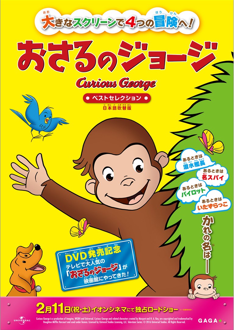 テレビアニメシリーズ『おさるのジョージ』のうち、「あんこう、ピカ!」「みる、きく、クンクン」「ミルクでおやすみ」「ゆめひこう」の4篇を劇場上映。Curious George is a production of Imagine, WGBH and Universal. Curious George and related characters created by Margret and H.A. Rey, are copyrighted and trademarked by Houghton Mifflin Harcourt and used under license. Licensed by Universal Studios Licensing, LLC. Television Series:(C)2017 Universal Studios. All Rights Reserved.