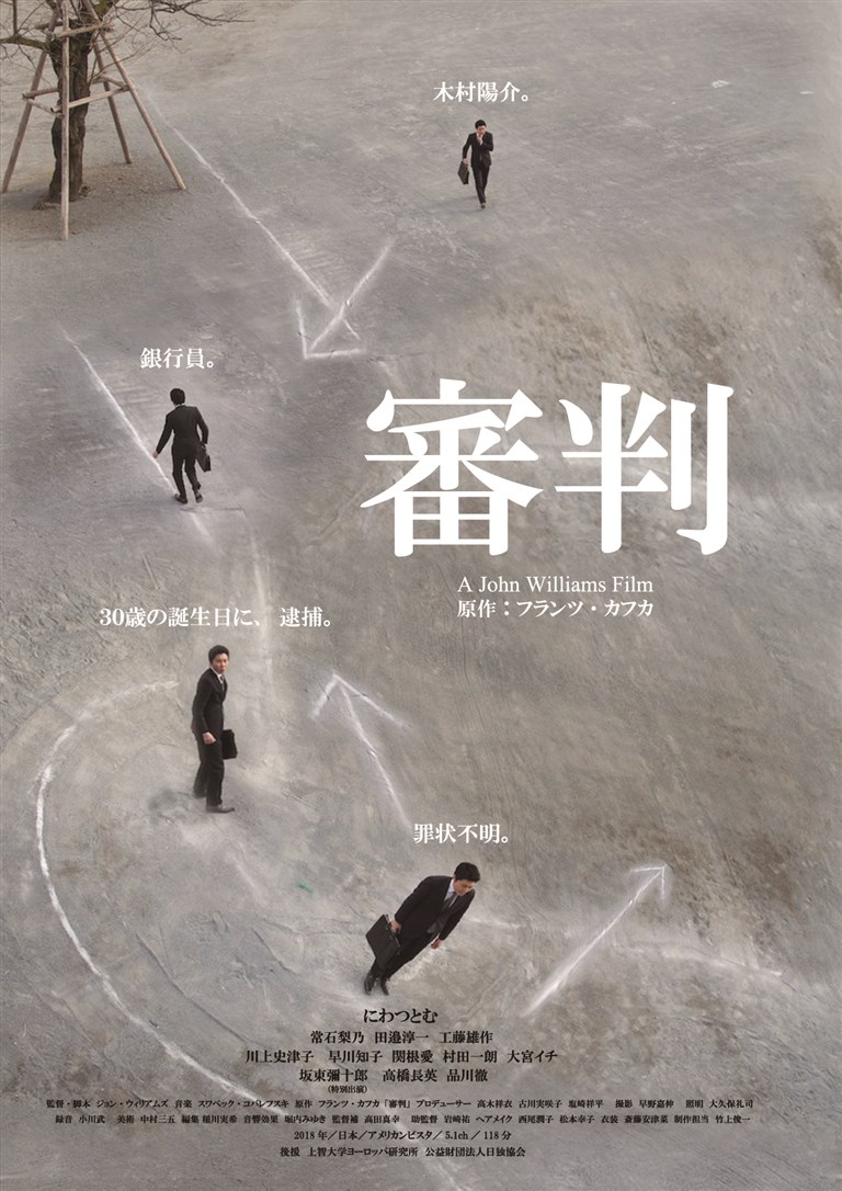 カフカの不条理小説『審判』を、現代の東京を舞台に映画化。30歳の誕生日の朝、銀行員の木村陽介が自宅マンションで目を覚ますと、そこには2人の見知らぬ男の姿が。理由も告げられぬまま男たちに逮捕された木村は、次第に身動きが取れなくなっていく……。メガホンを取ったのは、「SADO TEMPEST」のジョン・ウィリアムズ。共演は「彼らが本気で編むときは、」の品川徹、「たたら侍」の高橋長英。歌舞伎俳優の坂東彌十郎(「書かれた顔」)が23年ぶりに映画出演。