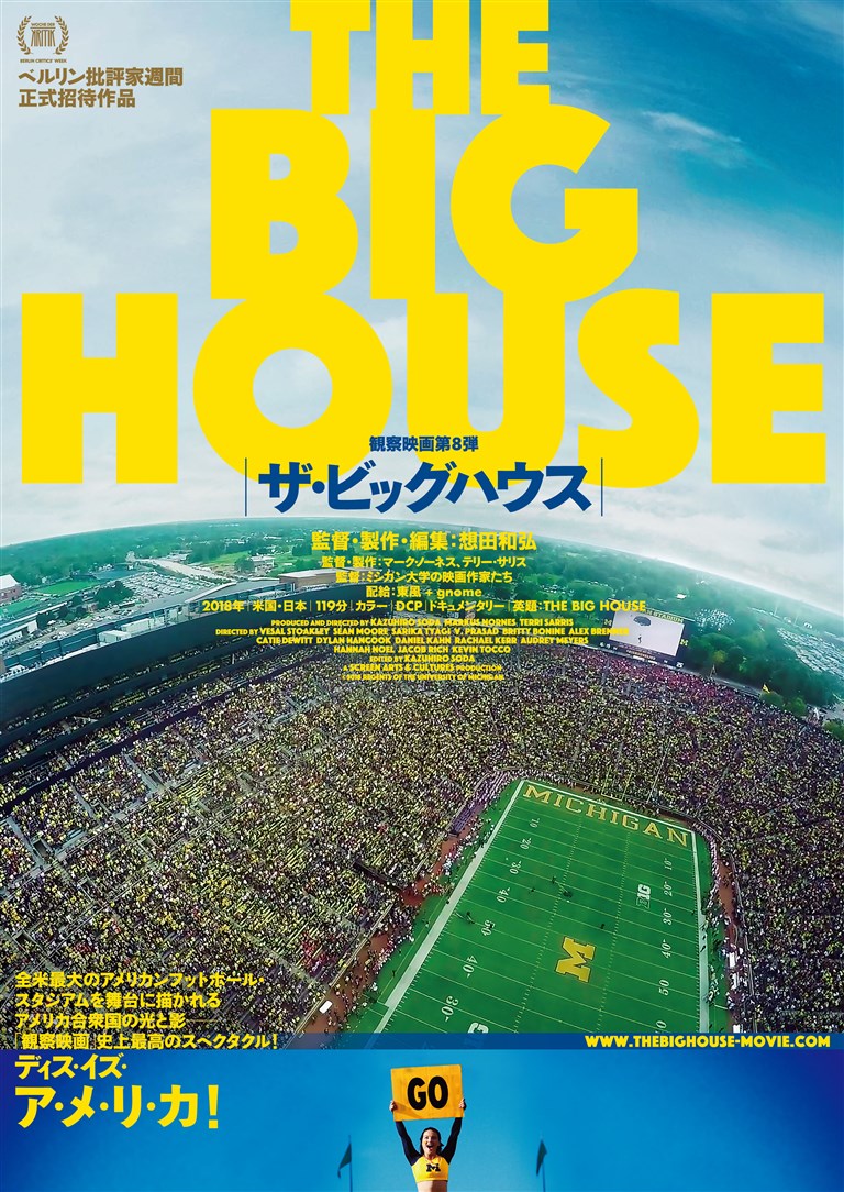 全米最大のアメリカンフットボール・スタジアム、通称“ザ・ビッグハウス”。パブリック・アイビーと称される名門ミシンガン大学が誇るミシガン・ウルヴァリンズの本拠地である。建設されたのは1927年。収容人数は10万人以上、地元アナーバー市の総人口に匹敵する。想田和弘と16人の映画作家たちが廻すキャメラが捉えたダイナミックなプレイ、熱狂する観衆、バックヤードで国民的スポーツを支える様々な人々……。それらの映像群が、想田の大胆かつ緻密なモンタージュによって、まるで巨大な生命体のように機能するスタジアムの全貌を描き出していく。それは現代アメリカの縮図でもある。教育とスポーツとビジネスの関係。人種や階級、格差、宗教問題。台頭するナショナリズムやミリタリズム……。アメリカが誇る文化と抱える問題とが“ザ・ビッグハウス”という小宇宙に浮かび上がる。