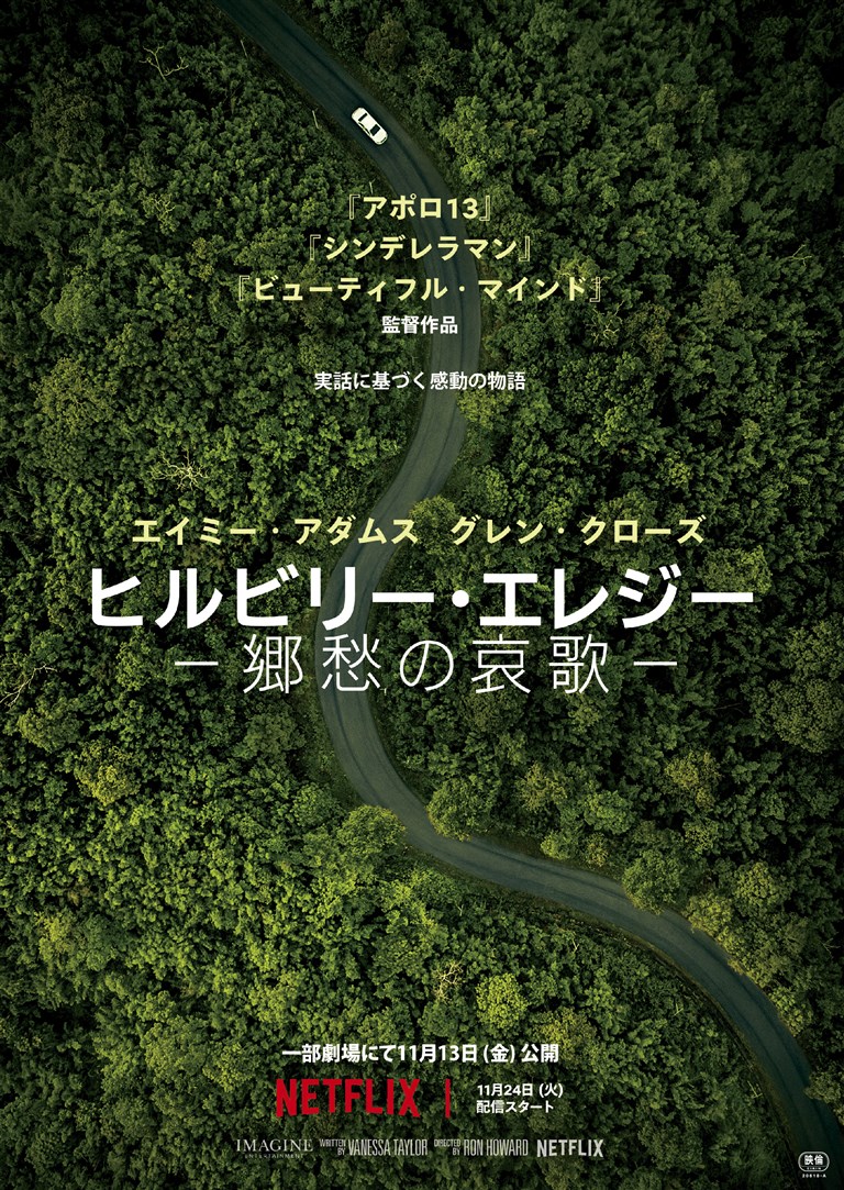 原作は、J・D・バンスの自伝的回顧録。アパラチア山脈の田舎に暮らす3世代にわたる家族の物語を名匠ロン・ハワードが手がけたNetflixオリジナル映画。2020年11月24日からのNetflixで独占配信に先駆けて、2020年11月13日から劇場限定公開。