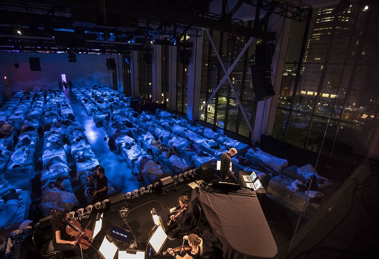 2018年7月、真夜中のロサンゼルス。総合芸術施設グランド・パークに、1人のミュージシャンがやって来る。“眠り”をテーマにした異色のコンサート『SLEEP』の中で演奏される音楽『SLEEP』の作曲を手掛けたマックス・リヒターだ。明け方まで8時間以上に及ぶコンサートに向け、リヒターたち演奏者は準備に余念がない。やがて観客が入場。ステージの前には簡易ベッドが並び、観客は寝袋を出したり、毛布を広げたり、それぞれのやり方でコンサートに備える。驚いたことに、ミュージシャンの演奏中、観客は寝てもいいし、会場を自由に歩き回っても、外に出ても構わないのだ。そんな型破りなコンサートをリヒターが思いついたのは、睡眠に対する素朴な興味からだった。睡眠は人間にどんな影響を与えているのか。音楽はどんな風に人間の脳に影響を与えるのか。リヒターは脳科学者デイヴィッド・イーグルマンの協力の下、音楽と睡眠を科学的に分析し、融合。これまで誰も味わったことのない新しい音楽体験、そして最高級の“眠り”と“目覚め”に導くための楽曲『SLEEP』を作り上げていく……。