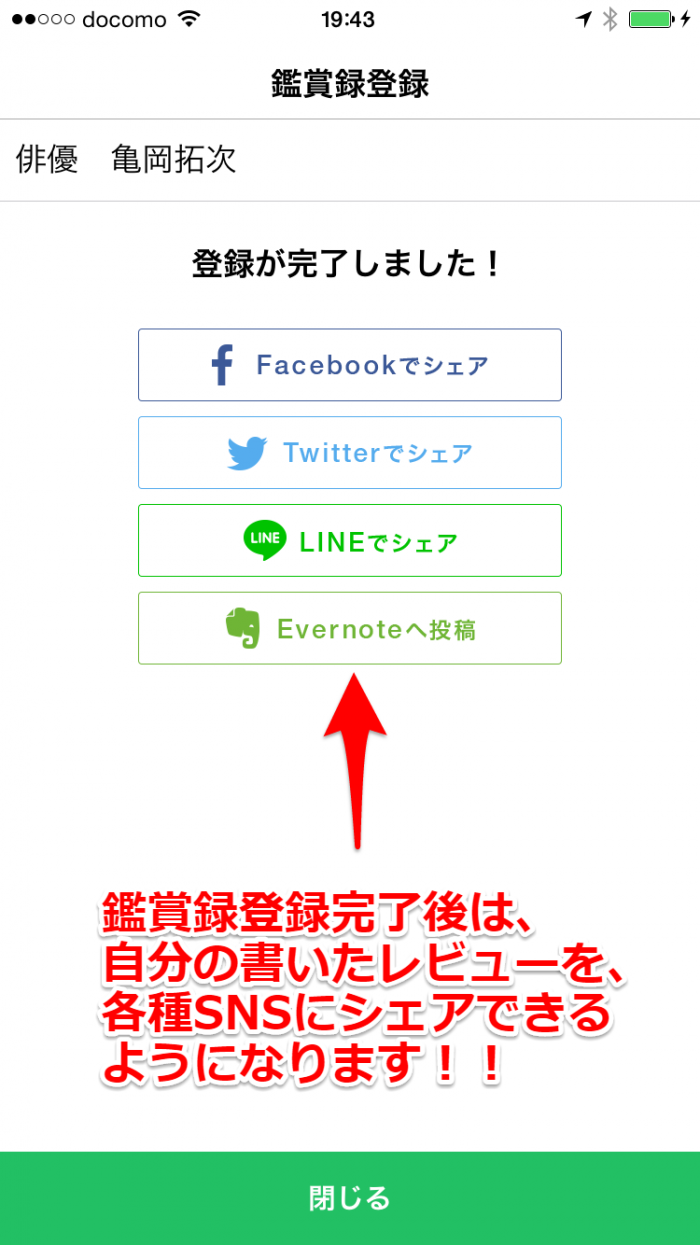 ●要望の多かったSNSシェア機能もアップデート版にて利用できるようになります!レビューを書いた後はFacebook、Twitter、LINEで友達にシェア。更にEvernoteへも投稿可能です。